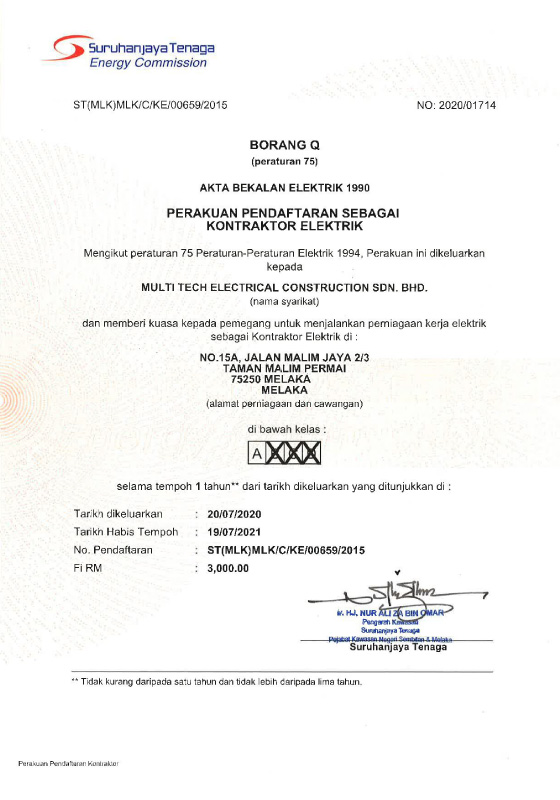 MULTI TECH ELECTRICAL CONSTRUCTION SDN BHD is the registered contractor for SURUHANJAYA TENAGA (KELAS A) and CIDB (G 7) on M&E Scope. In our quest to achieve our business objectives of adding value and to stay competitive in the industry, we have to pursue our company‘s vision to ensure our services are the highest quality and to demonstrate its ability to provide expertise and related services that consistently meet customer requirements.